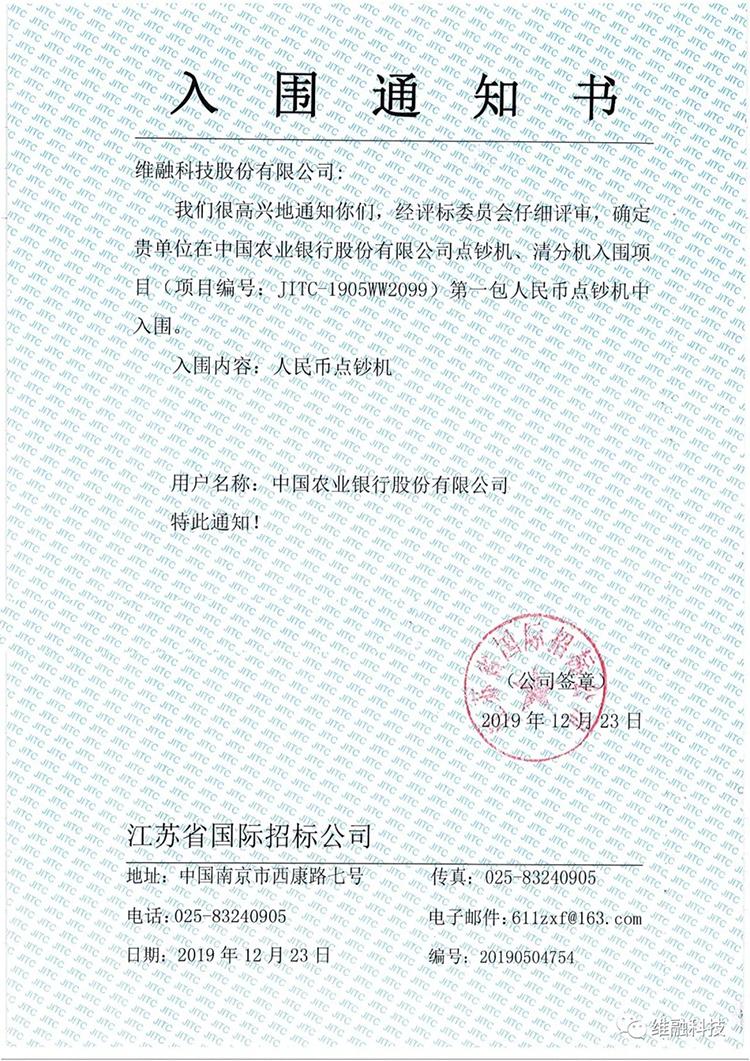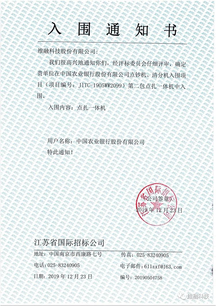 近日,維融科技股份有限公司收到江蘇省國際招標公司發出的《中國農行股份有限公司點鈔機、清分機入圍通知書》(項目編號:JITC-1905WW2099),確定維融科技中標,中標產品包括:人民幣點鈔機、點扎一體機。