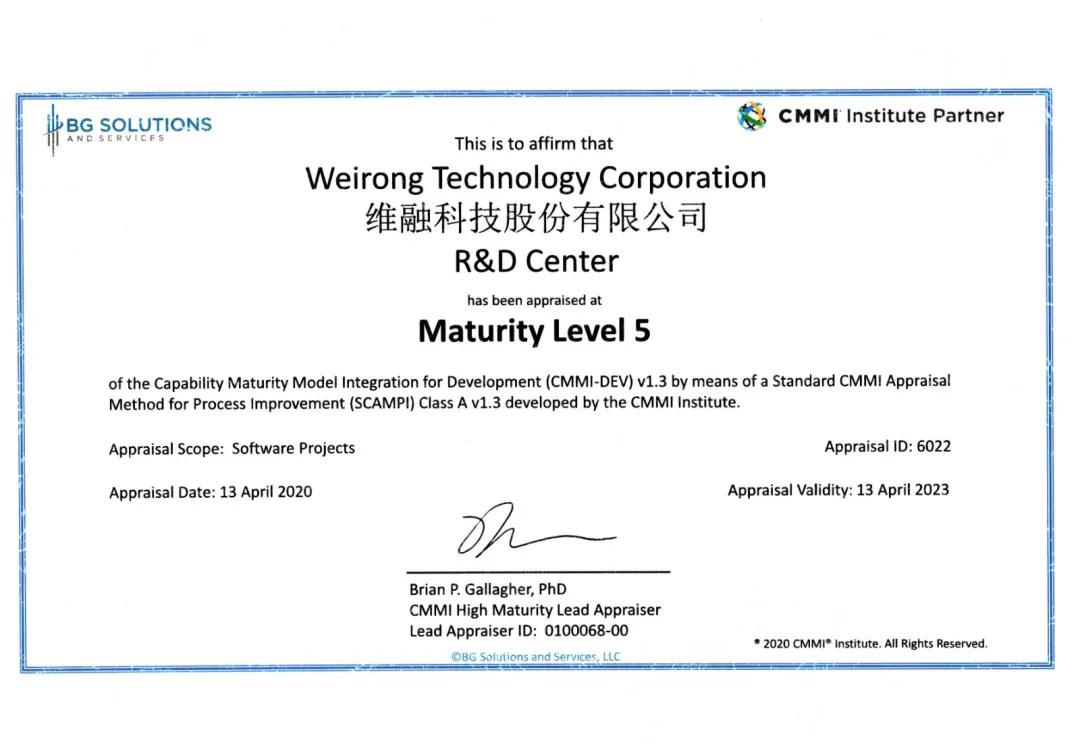 2020年4月13日,維融科技股份有限公司正式通過CMMI5級評估認證,標志著公司在軟件過程組織、技術研發、項目管理、方案交付等方面達到了國際先進水平。?