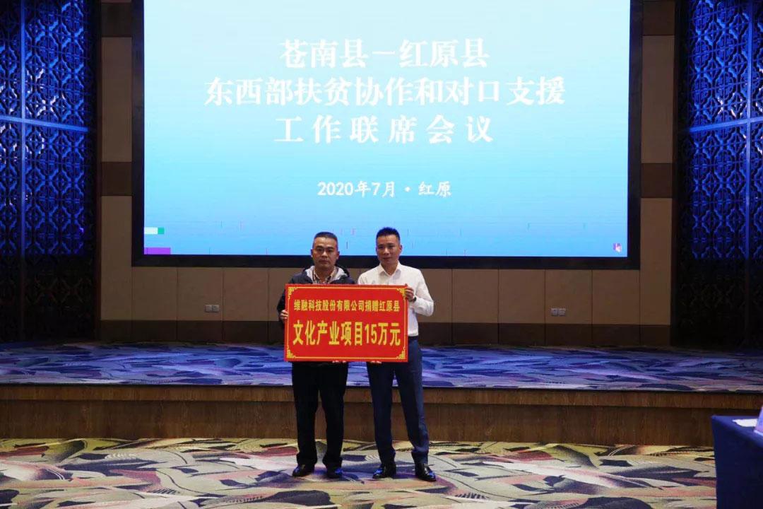 會議上,舉行了結對幫扶協議簽訂和資金受授儀式,蒼南縣慈善總會、維融科技單位等對口支援與紅原縣文旅局。維融科技捐贈紅原縣文化產業項目15萬元,以助力紅原縣文化產業項目的開展和落實。