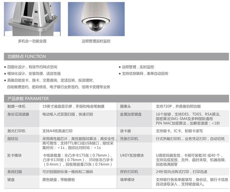 具備自助發卡、換卡、交易查詢、定活互轉、投資理財、 自助繳費簽約、密碼修改、電子銀行業務簽約、信用卡受理等業務